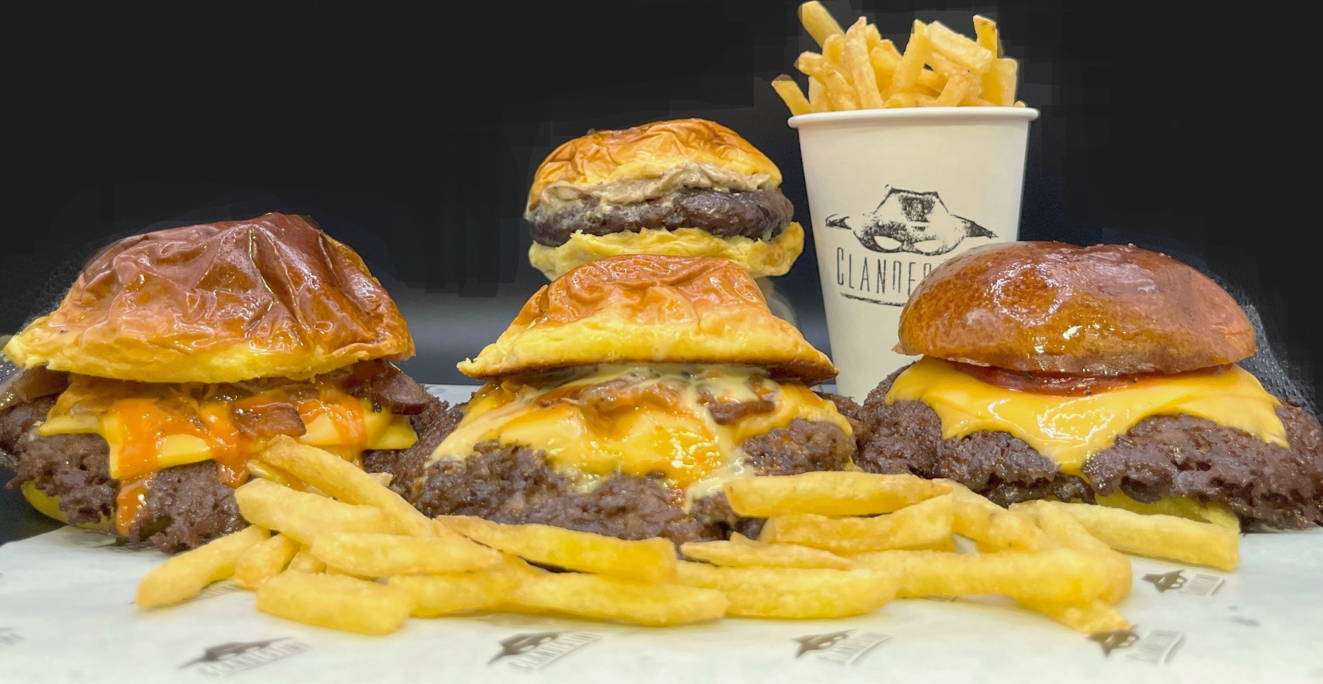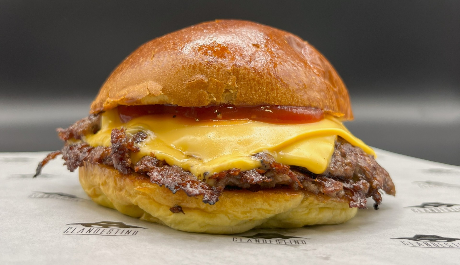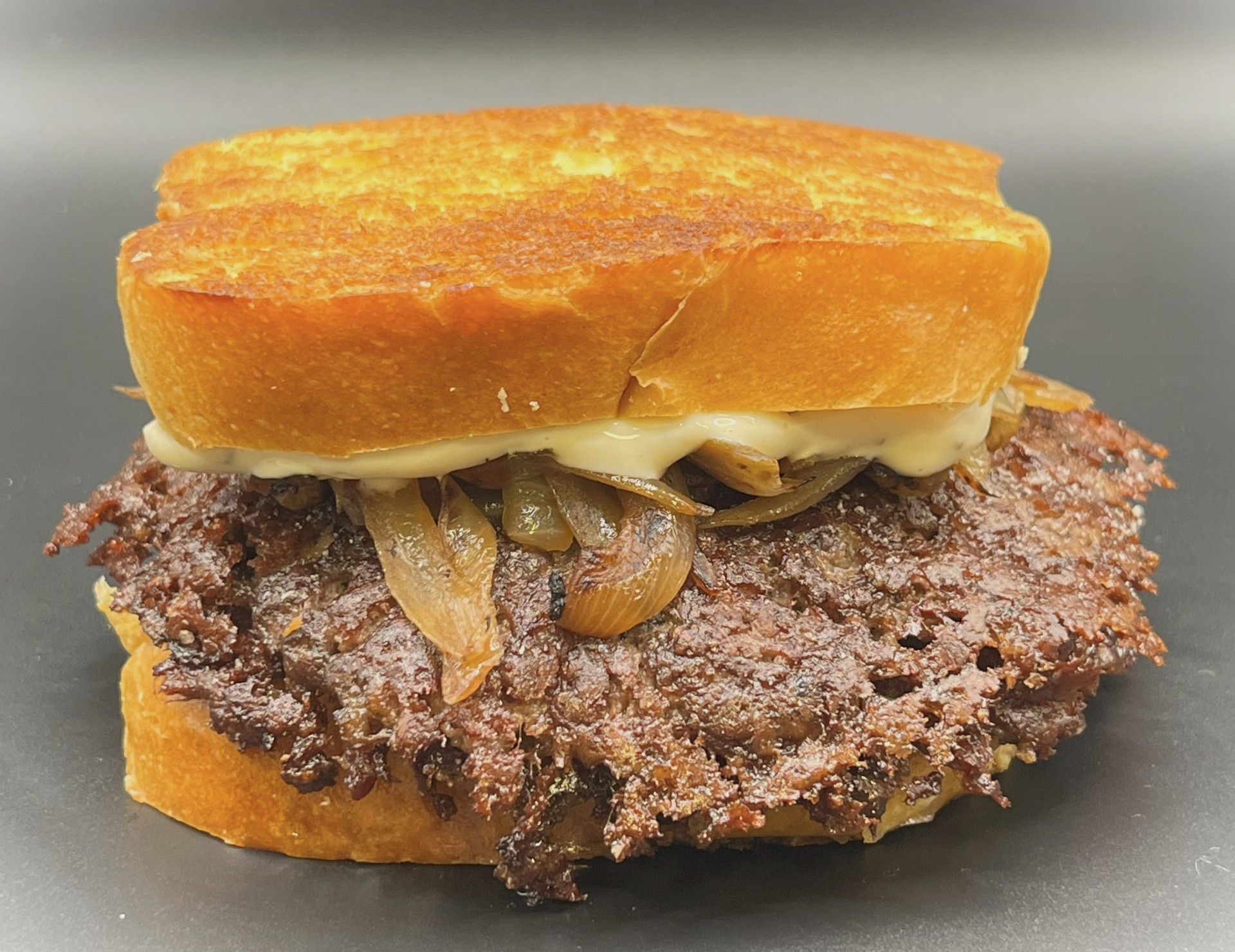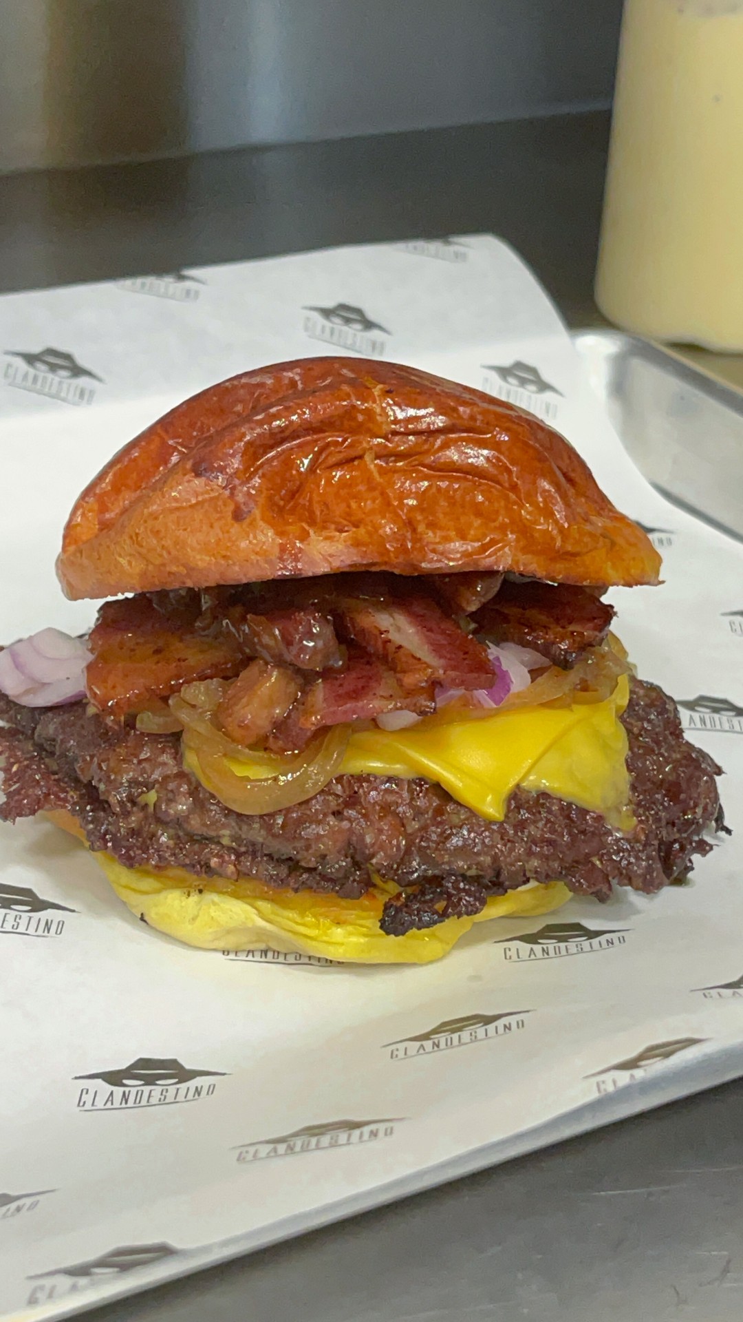 PAN DE PATATA + DOBLE CARNE SMASH + BACON AHUMADO+ QUESO TRUFADO TIPO BRIE + CEBOLLA MORADA + CEBOLLA CONFITADA Y SALSA TRUFADA DE LA CASA.
